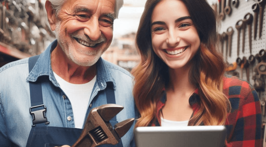 Ahora, añadamos a Laura, su nieta de 20 años, llena de energía y con un dominio innato de las nuevas tecnologías. Laura ha crecido viendo a su abuelo trabajar, admirando su dedicación y aprendiendo de sus historias. Ella trae consigo nuevas ideas, introduce el negocio en el mundo digital, crea una página web, maneja las redes sociales y, de repente, la pequeña ferretería de Don Manuel tiene un alcance mucho mayor. Su entusiasmo y su capacidad para adaptarse rápidamente a los cambios modernos son el complemento perfecto para la sabiduría de su abuelo.